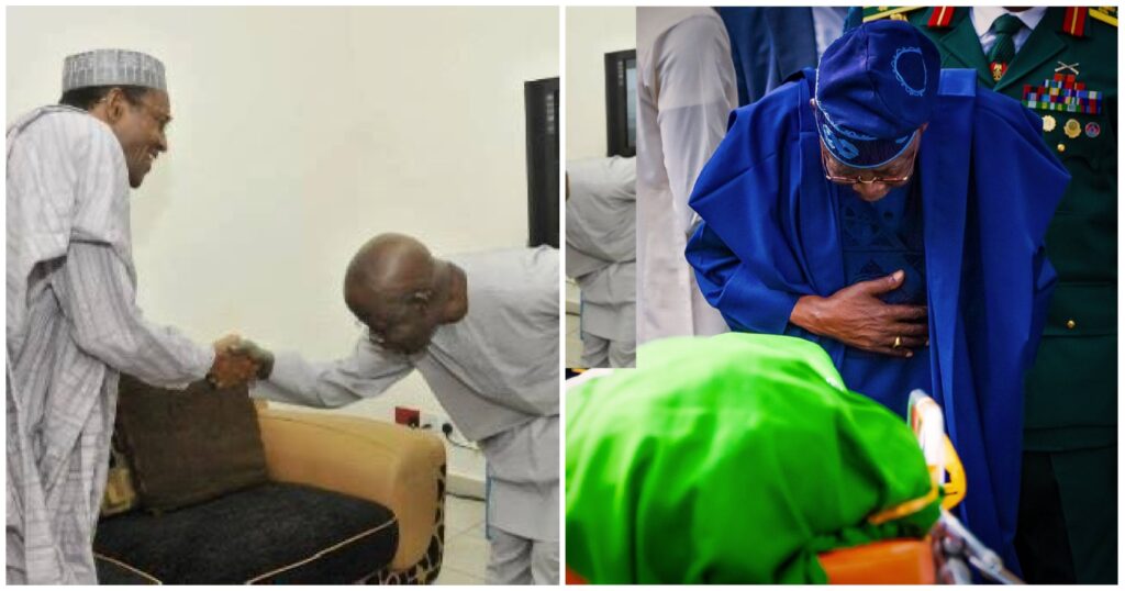 An ga hoton yanda shugaban kasa, Bola Ahmad Tinubu ya duka yake gaishe da Tsohon shugaban kasa, Muhammadu Buhari.