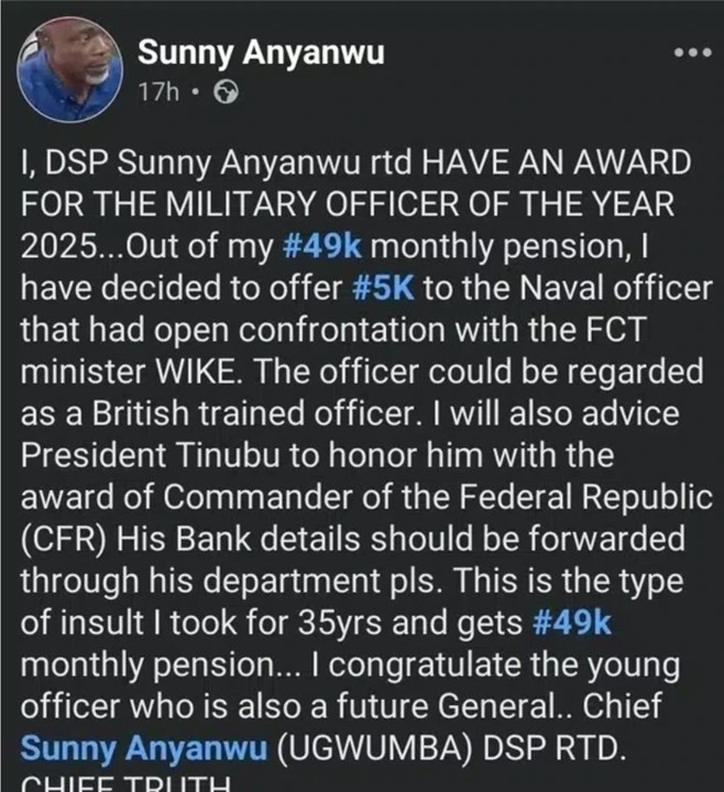 Tsohon dansandan Najeriya, Sunny Anyanwu ya gabatar da Naira dubu 5 daga cikin dubu 49 da yake karba a matsayin kudin fansho ga sojan ruwa AM. Yerima.
