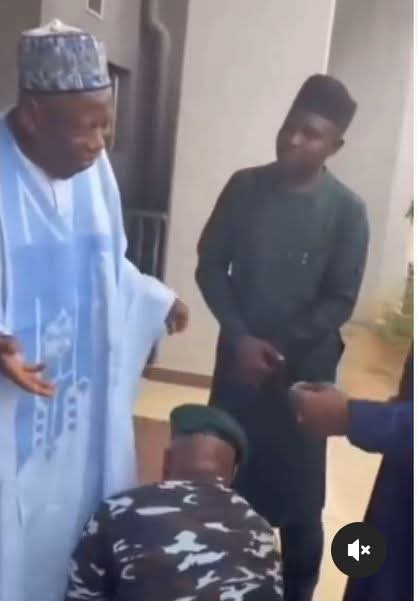 A cikin wani bidiyo da ya karade intanet, an ga Ganduje tsaye yayin da dansandan da ba a bayyana sunansa ba ya durƙusa ya na ɗaura masa igiyar takalmi.
