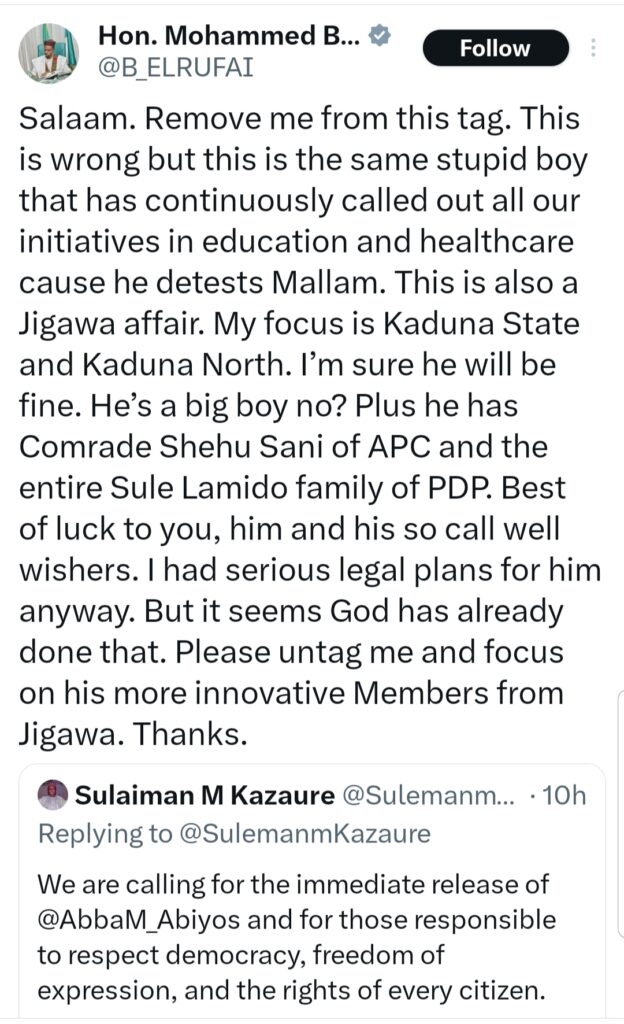 Dan majalisar wakilai daga jihar Kaduna wanda da ne a wajan tsohon gwamnan Kaduna, Malam Nasiru Ahmad El-Rufai, watau Bello El-Rufai ya bayyana cewa, ba ruwansa yayin da aka kirashi ya dauki mataki kan batan dan fafutuka na jihar Jigawa, Abayo Roni.
