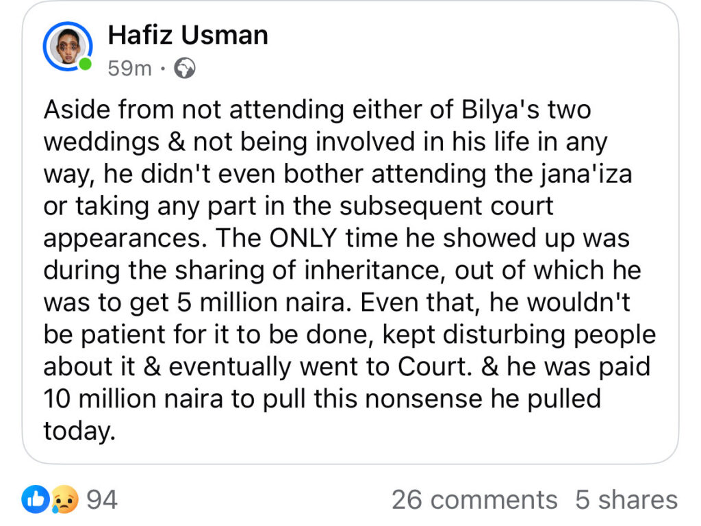 Bayan da mahaifin Bilyaminu ya fito ya ce ya yafewa Maryam Sanda kuma shine ma yayi kokarin ganin Shugaba Tinubu ya yafe mata, Wani dan Uwan Biliyaminun ya fito yace bayan rasuwar Biliyaminu, Mahaifin ya hanasu sakat akan Gado, Aka bashi Miliyan 5 amma yace bai yadda ba, ya je kotu saida aka bashi Miliyan 10 daga cikin kudin gadon