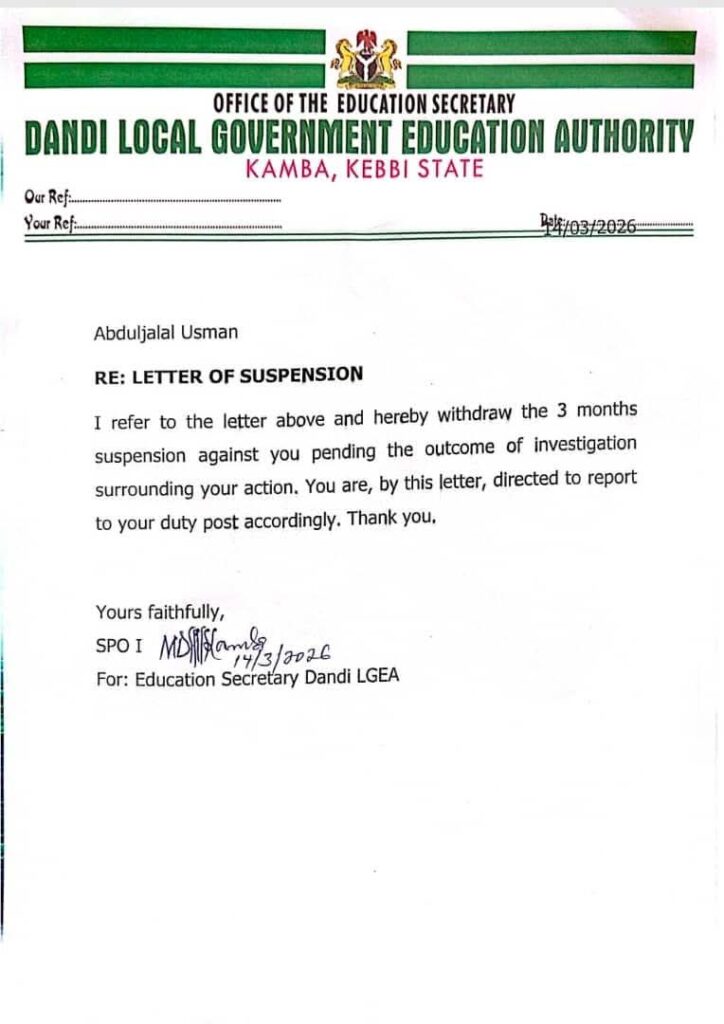 Rahotanni daga jihar Kebbi na cewa, Gwamnatin jihar ta mayar da malamin Makaranta, Abduljalal Usman bakin aikinsa bayan da suka ta yi yawa a kafafen sadarwa.