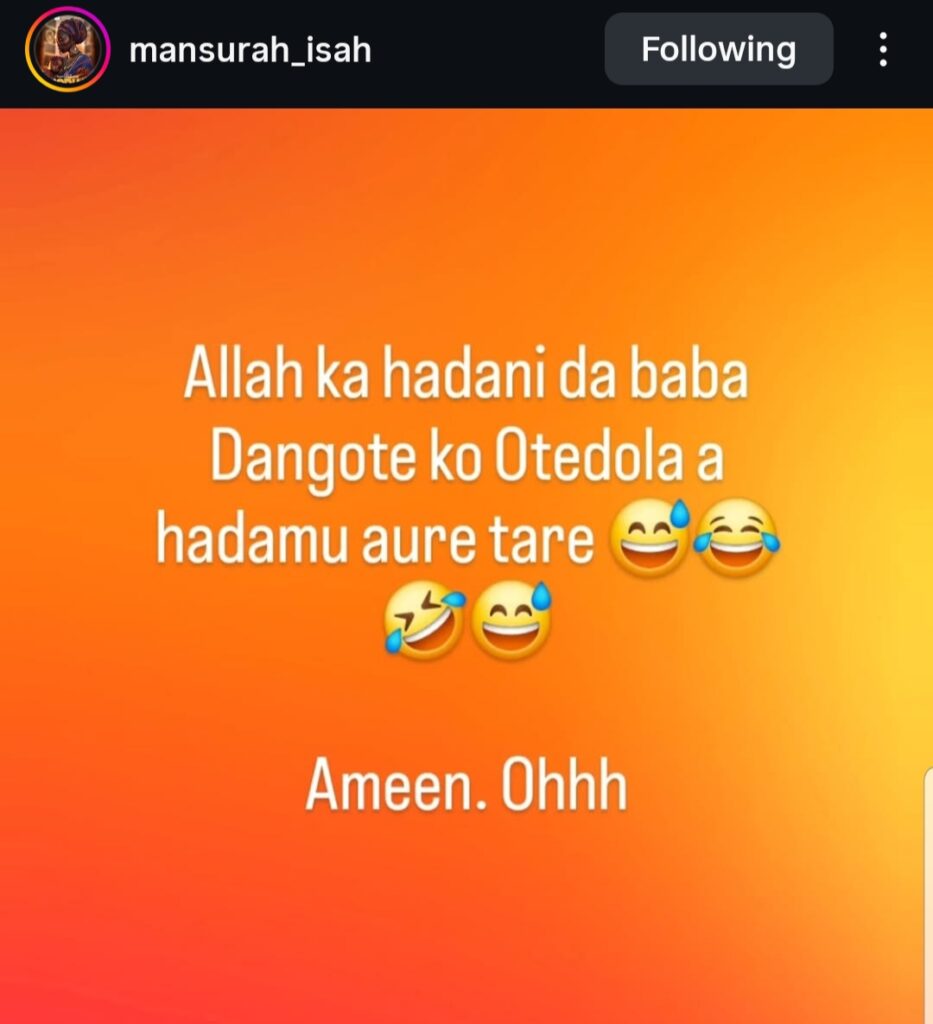 Tauraruwar fina-finan Hausa, Mansurah Isah ta bayyana cewa, tana da burin auren daya daga cikin masu kudin Najeriya, Aliko Dangote ko Femi Otedola.