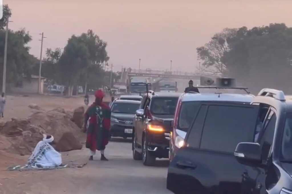 An ga masu sarautar Gargajiya a kauyen sun fito suna gaisheshi yayin da yake zaune a cikin mota.