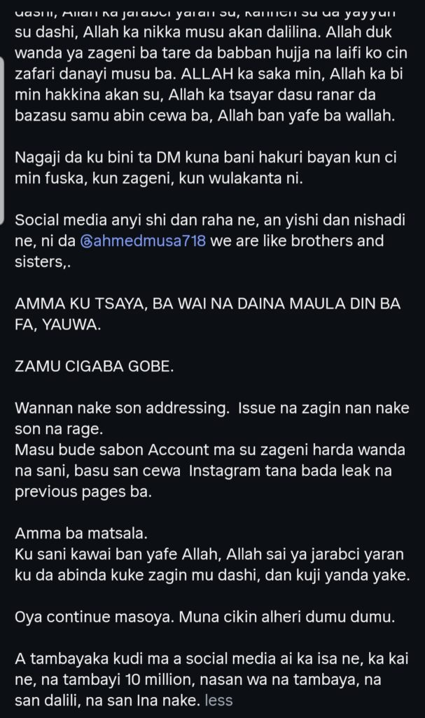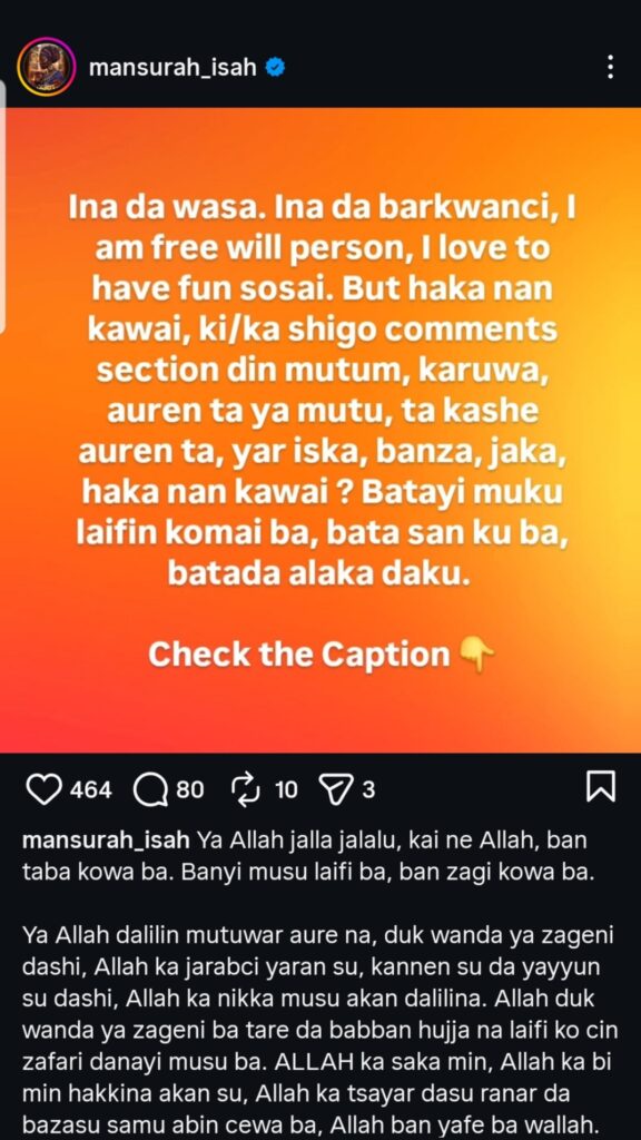 Tsohuwar Tauraruwar fina-finan Hausa, Mansurah Isah ta bayyana cewa, duk wanda ya zageta saboda ta roki Ahmed Musa kyautar Naira Miliyan 10 bata yafe ba.