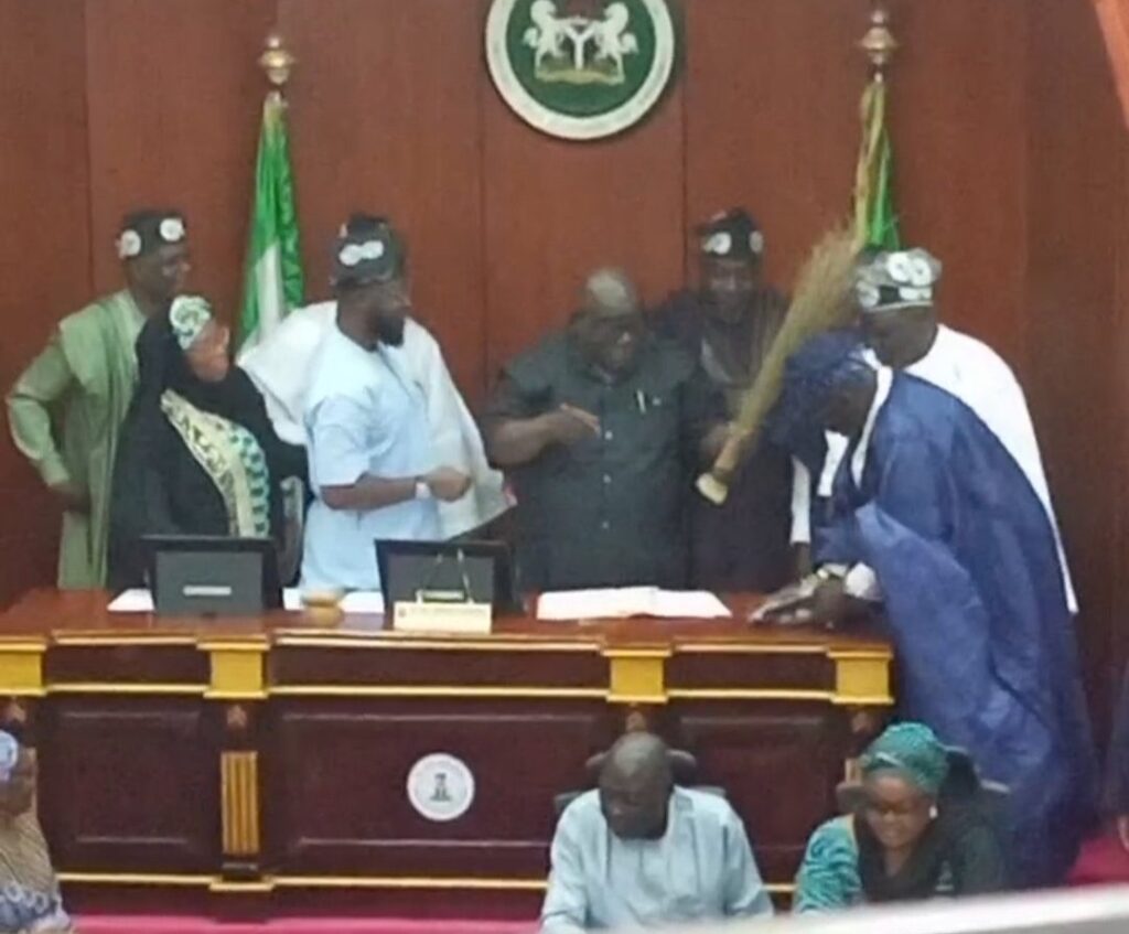 An ga yanda aka baiwa kakakin majalisar jihar, Rt. Hon. John Kizito Bonzena tutar Jam’iyyar APC da kuma Tsintsiya.
