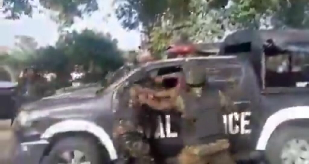 A cikin tawagar motocin dake masa rakiya, an ga wasu sojoji sun tsaya a hanya suna dambe.