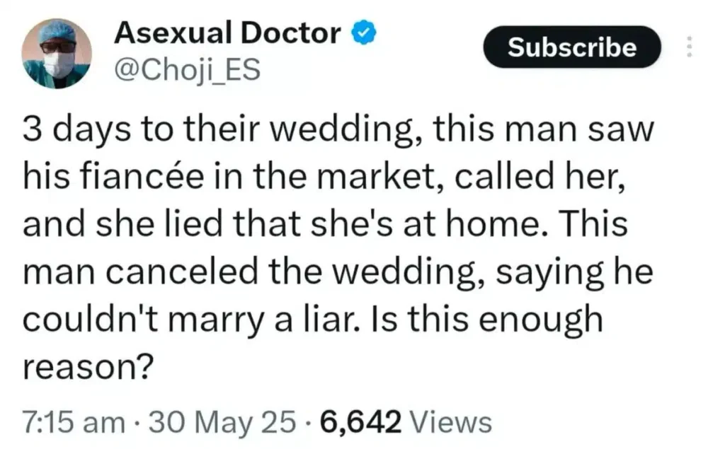 Sai tace masa tana gida, Anan yace ya fasa auren saboda karyar data yi masa, kuma hakan ya farune yayin da ake saura kwanaki 3 a daura musu aure.