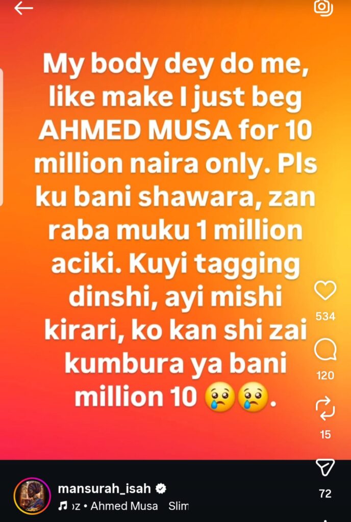 Tsohuwar Tauraruwar fina-finan Hausa kuma Tsohuwar matar Sani Musa Danja, Mansurah Isah ta bayyana cewa tana rokon Tauraron kwallon Najeriya, Ahmed Musa ya bata kyauta Naira Miliyan 10.