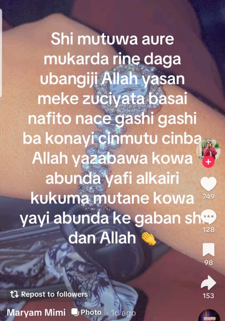 Ta wallafa a shafinta na Tiktok cewa mutuwar Aure kaddarace kuma ita kadai tasan abinda take ji a zuciyarta ba zata gayawa Duniya ba.