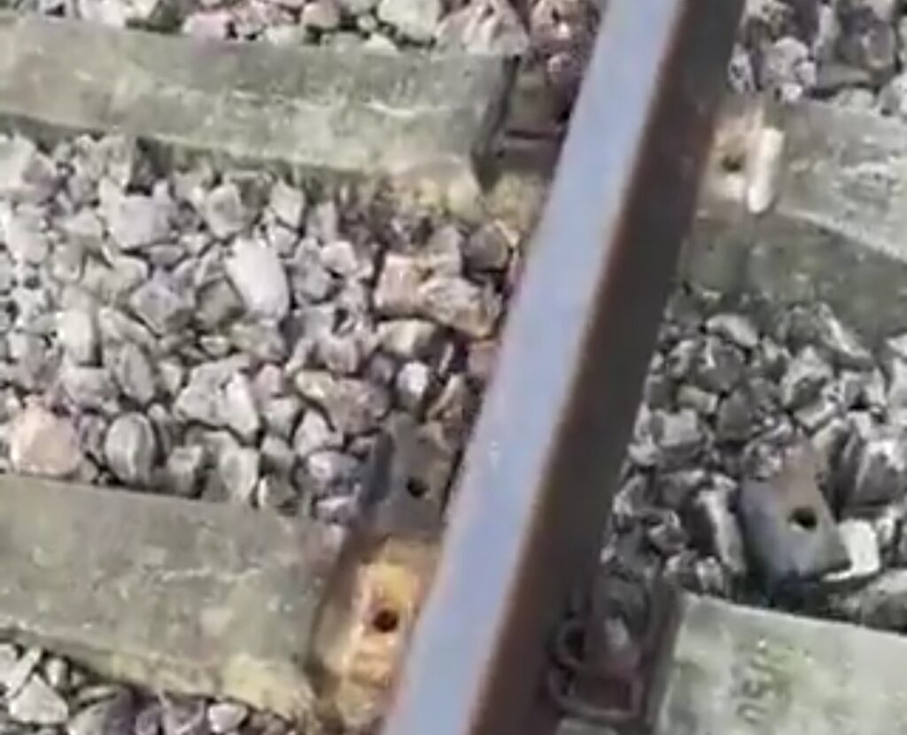 A Bidiyon an ga yanda wani ke nuna karafan jirgin kasan a kwance babu wani karfe dake rike dasu.