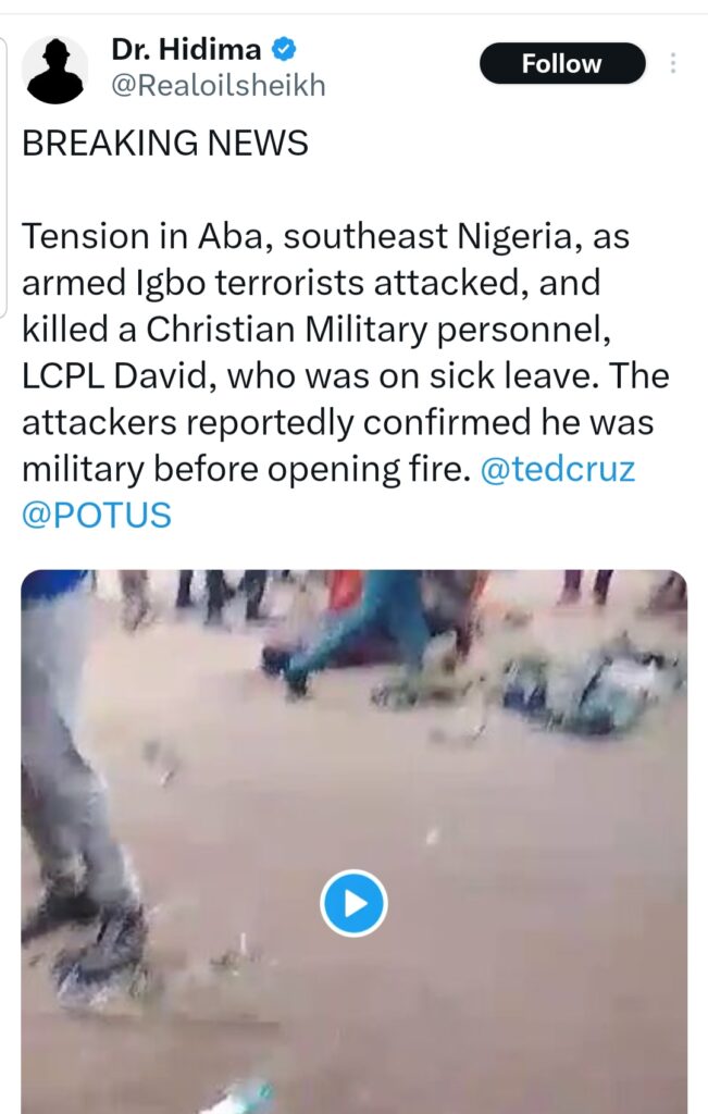 Wasu da ake zargin ‘yan Kungiyar ÌPÒB ne masu son kafa kasar Biafra a birnin Aba na jihar Abia, sun hallaka wani sojan Najeriya me suna David.