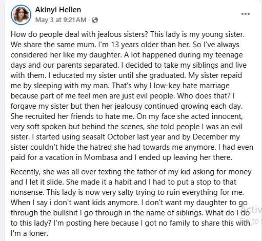 Wata mata me suna Akinyi Hellen na neman shawarar yanda zata yi da kanwarta uwa daya uba daya data kwanta da mijinta.