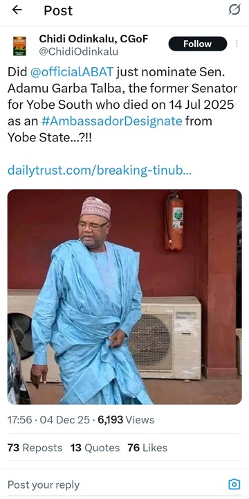 Rahotanni sun bayyana cewa, Shugaban kasa, Bola Ahmad Tinubu ya aika da sunan matacce a cikin sunayen wadanda yake son baiwa mukamin jakadanci zuwa majalisa.