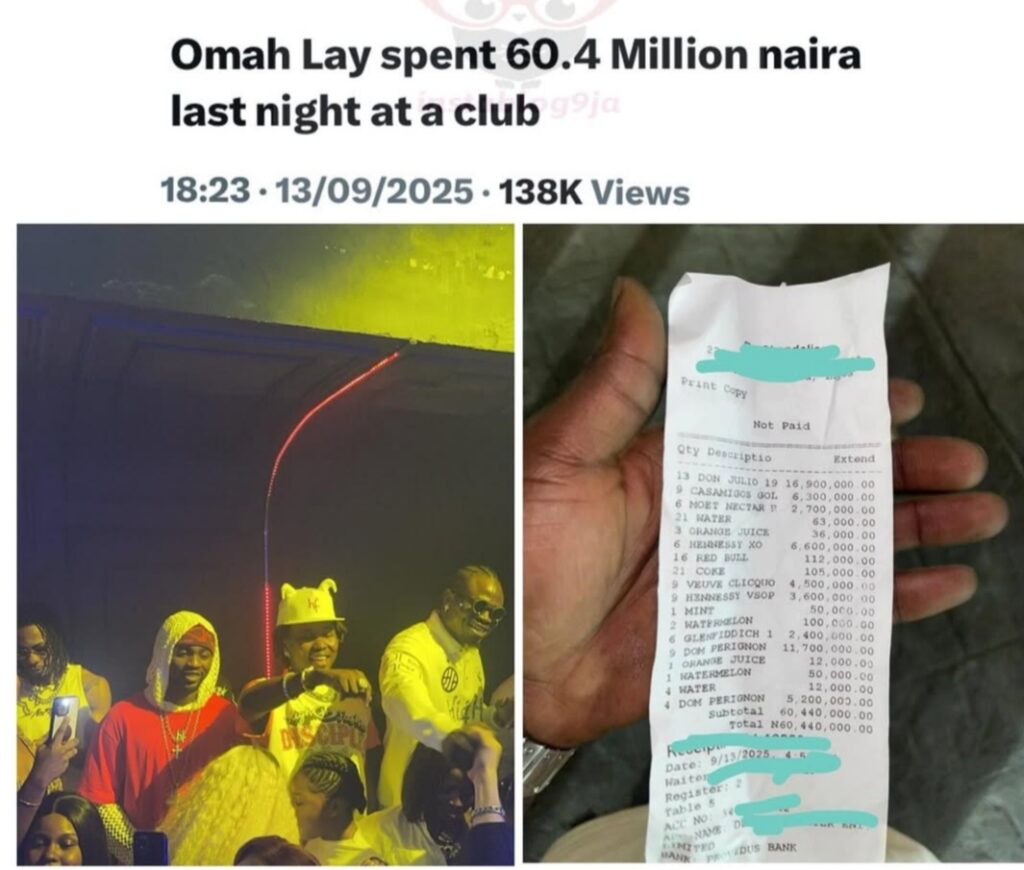 Rahotanni sun bayyana cewa, Tauraron mawakin Kudu Omah Lay ya kashe Naira Miliyan 60 a gidan rawa, Watau Club.
